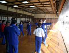 前富山県弓道連盟会長の大角恭三先生を講師に招き、道具の呼び名に始まり、「足踏み」(的に向かって両足を踏み開く動作)から「残心」(矢が放たれた後の姿勢)にいたるまで、丁寧に教えていただきました。