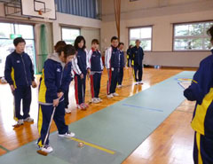 2日目は、小矢部市の若林体育館で、小矢部市スポーツ推進委員協議会とスポーツ交流を行いました。小矢部市スポーツ推進委員の皆さんからチュックボールをご指導いただき、黒部市からはスティックリングを紹介しました。